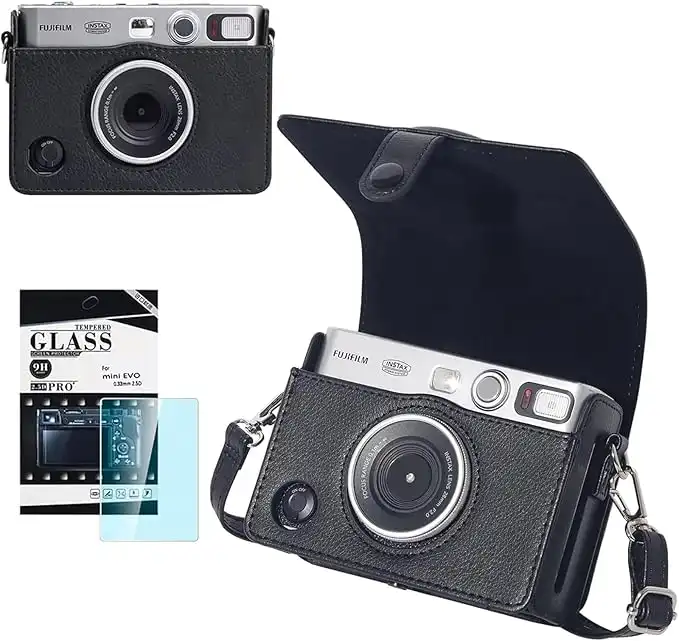 [1+1] Case for Fuji Mini EVO with 1 Sreen Protector, Camera Case Compatible for Fuji Mini EVO Camera with Adjustable Shoulder Strap in Lychee Texture Horizontal Style (Black)