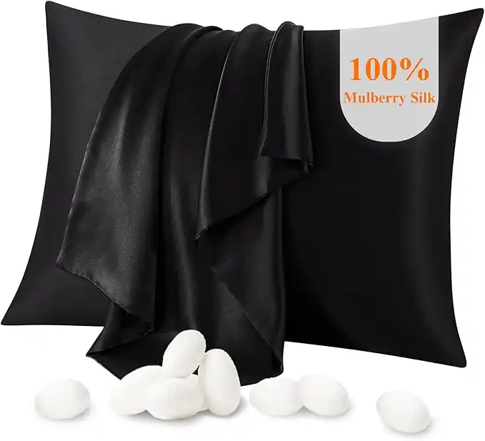 100% Silk Pillowcase for Hair and Skin, Pillow Cases Both Side Mulberry Silk Pillowcases 21 Momme 600 Thread Count Hidden Zipper Smooth Soft(Black, Standard 50x66cm,1pcs)