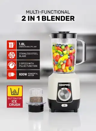 2-in-1 Blender, Powerful Motor With 2 Speed Setting and Pulse| Transparent And Unbreakable Jars With Stainless Steel Blade, Grinder Attachment| Perfect For making Smoothies, Milkshakes, Etc And Grinding Beans, Coconut, Nuts, Etc|2 Years Warranty 1.8 L 600 W GSB44027T White/Black