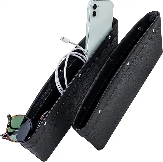 amazon.ae2 in 1 Car Seat Gap Organizer | Universal Fit | Storage Pockets Adjust | 2 Set Car Seat Crevice Storage Box | Helps Reduce Distracted Driving & Holds Phone Money Cards Keys Remote | Black Stitching