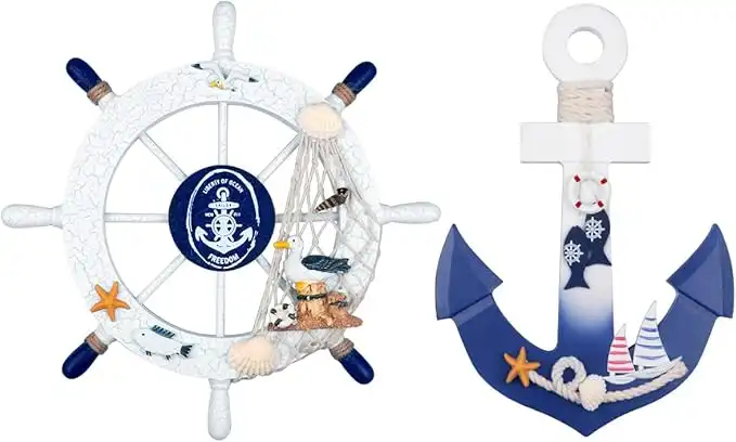 amazon.ae2 Pack 11" Nautical Beach Wooden Ship Wheel and 11" Wooden Anchor with Rope Nautical Boat Steering Wheel Rudder Anchor Wall Art Decor Door Hanging Ornament Beach Theme Home Decoration(White&Blue)
