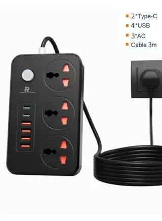 3 meters Universal Extension Cord with 3 Power Socket and 4 USB + 2 PD Slots 3 Way Power Strip with USB type C PD Charging slot Extension Lead 3 meter
