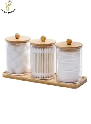 noon.com3-Pack Organizer Jar Set With Bamboo Lid and Tray Triple Pieces Acrylic Storage Organizing Box Suit For Bathroom Makeup Cotton Swabs Toner Pad Facial Pad Rubber Band Office Clips Staples Kitchen Spices etc