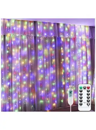 300LED Curtain Fairy Lights, Ramadan Fairy Light, 3X3Meters Remote Control, 8 Lighting Modes, USB Powered, for Eid Party, Home, Bedroom, Indoor Outdoor Wall Decoration (Multicolor)