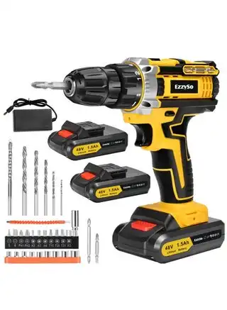 noon.com48V Cordless Drill, Two Li-Ion Batteries and Fast Charger, 3/8" Drill Kit, 25+3 Position Clutch, LED Work Light, Variable Speed Drill, 186 lbs of Torque, 24 Accessories + 32-Piece Drill Bit Box