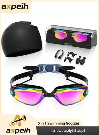 noon.com5-in-1 Anti-Fog Pro Swim Goggles Set for Adults with Silicone Swim Cap, Anti-Fog UV Protection, Clear Vision, 180° Panoramic, Durable PC Material - Waterproof Swimming Accessories Kit with Carry Case, Nose Clip, & Earplugs (Black Purple)