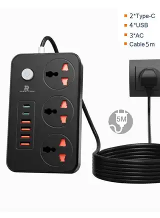 5 meters Universal Extension Cord with 3 Power Socket and 4 USB + 2 PD Slots 3 Way Power Strip with USB type C PD Charging slot Extension Lead 5 meter