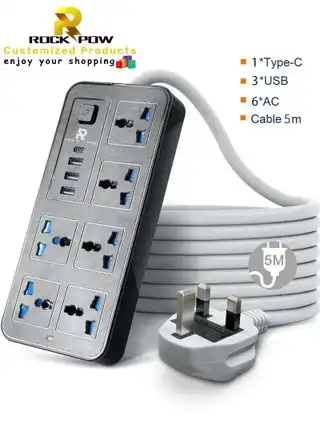 noon.com5 meters Universal Extension Lead with Multiple Function UK Plug 3 Pin Socket Outlet with 6 Gang 3 USB Port 1 Type-C Port 5M Electric Socket Mains Strip for Home Kitchen and Office 5 meters