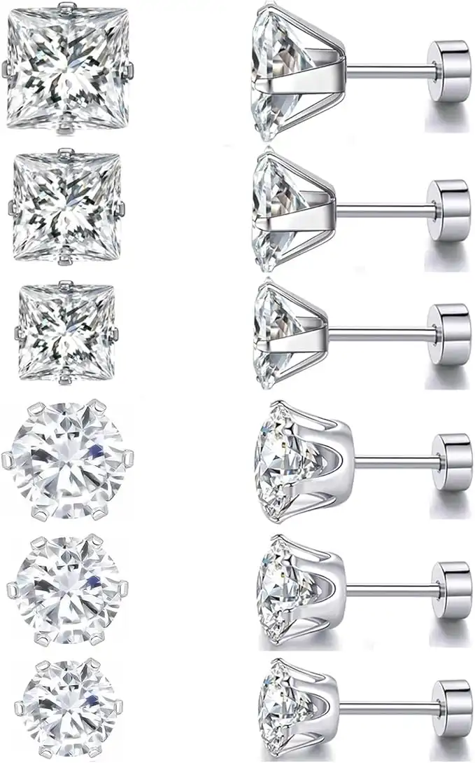 6 Pairs CZ Surgical Stainless Steel Stud Earrings Screw Back Hypoallergenic