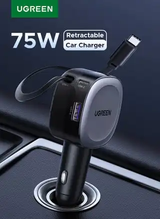 75W Car Charger Adapter USB Type C With 0.75M Retractable Cable With 2C1A Ports Tangle-Free Fast Charging, Fireproof PC Material Compatible With Macbook Pro Air, iPad, iPhone, Galaxy,Xiaomi