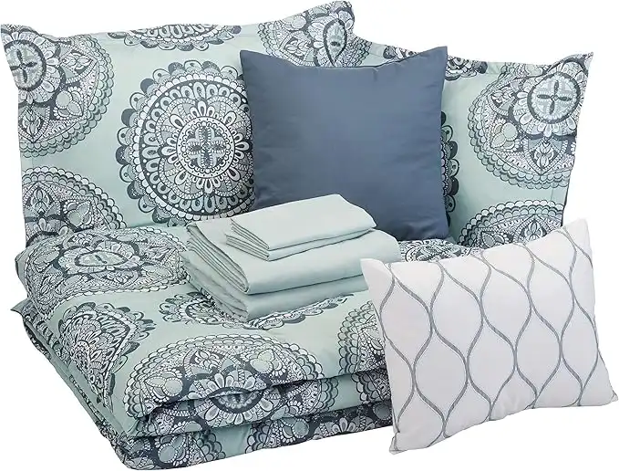 Amazon Basics 10-Piece Bed-in-a-Bag - Soft, Easy-Wash Microfiber - Full/Queen, Sea Foam Medallion — Price History & Tracker | DeserTracker