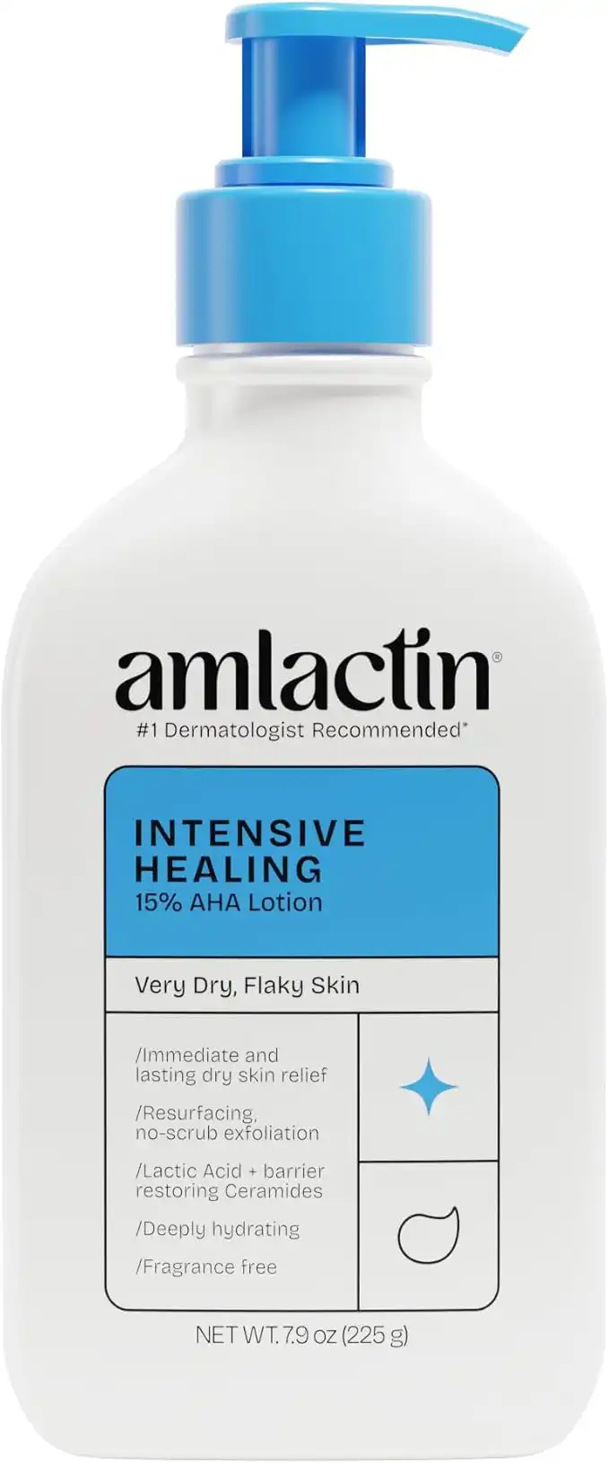 AmLactin Intensive Healing Body Lotion for Dry Skin, 7.9 oz Pump Bottle, 2-in-1 Exfoliator and Moisturizer with Ceramides and 15% Lactic Acid for 24-Hour Relief from Dry Skin (Packaging May Vary)