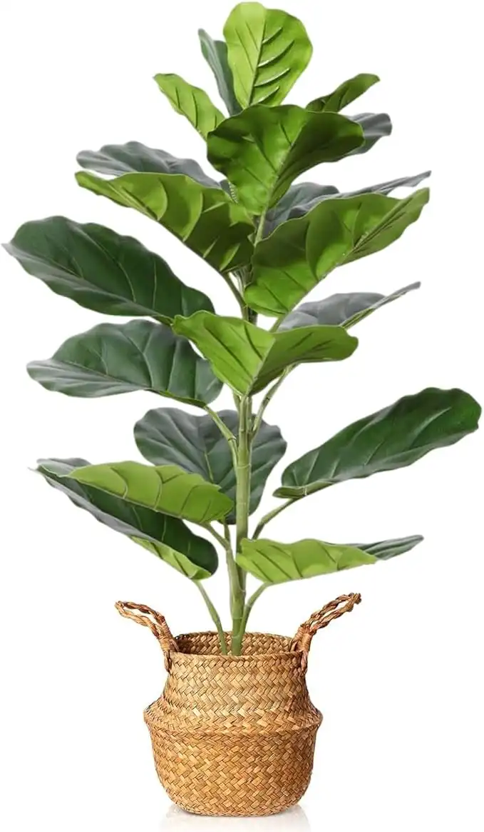 Angju Artificial Plants 70cm Fake Fiddle Leaf Fig Tree, with 21 Leaves in Pot and Woven Seagrass Basket, Perfect Faux Ficus Lyrata Plant for Home Indoor Outdoor Office Modern Decor Green