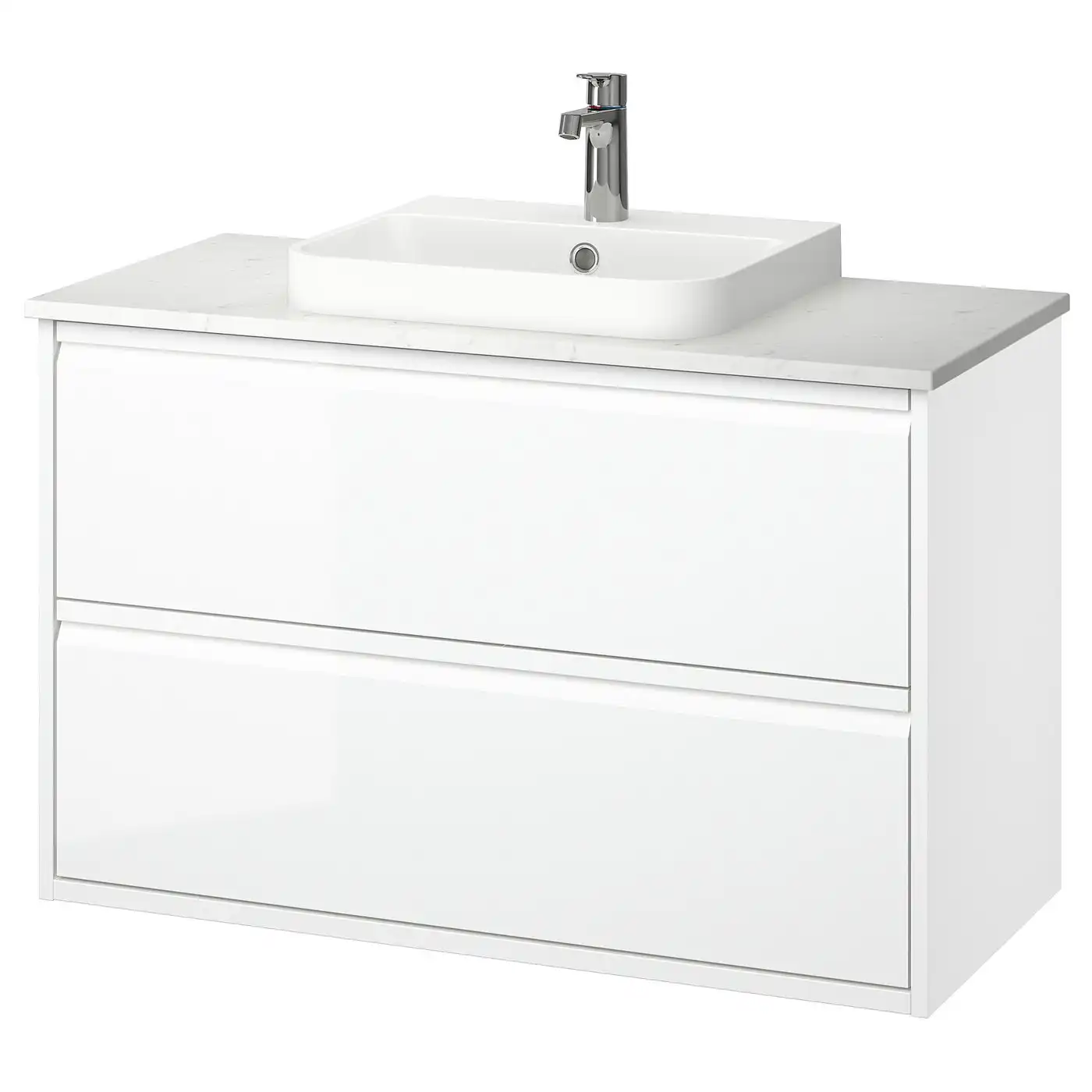 ÄNGSJÖN / BACKSJÖN Wash-stnd w drawers/wash-basin/tap - high-gloss white/white marble effect 102x49x71 cm