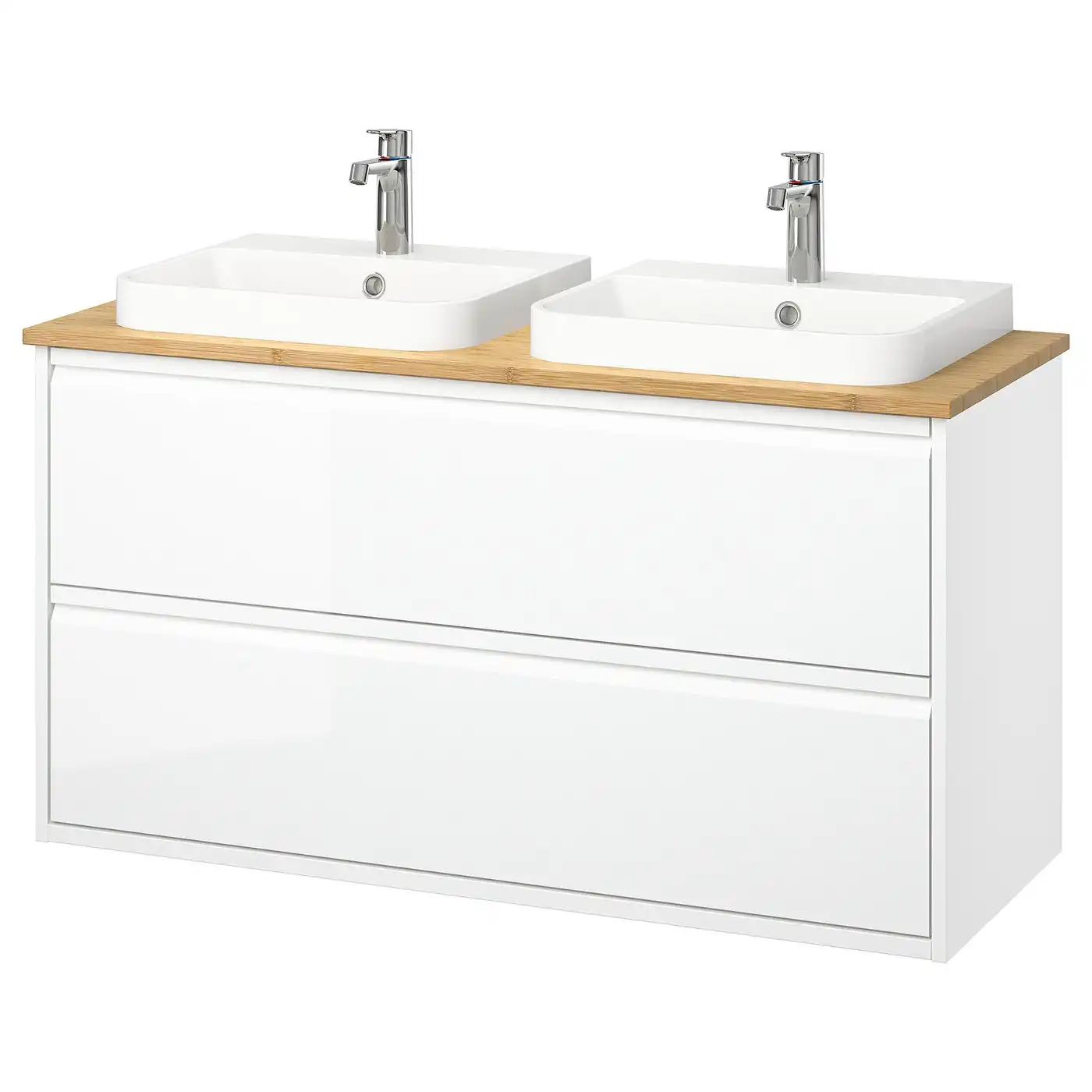ÄNGSJÖN / BACKSJÖN Wash-stnd w drawers/wash-basin/taps - high-gloss white/bamboo 122x49x71 cm