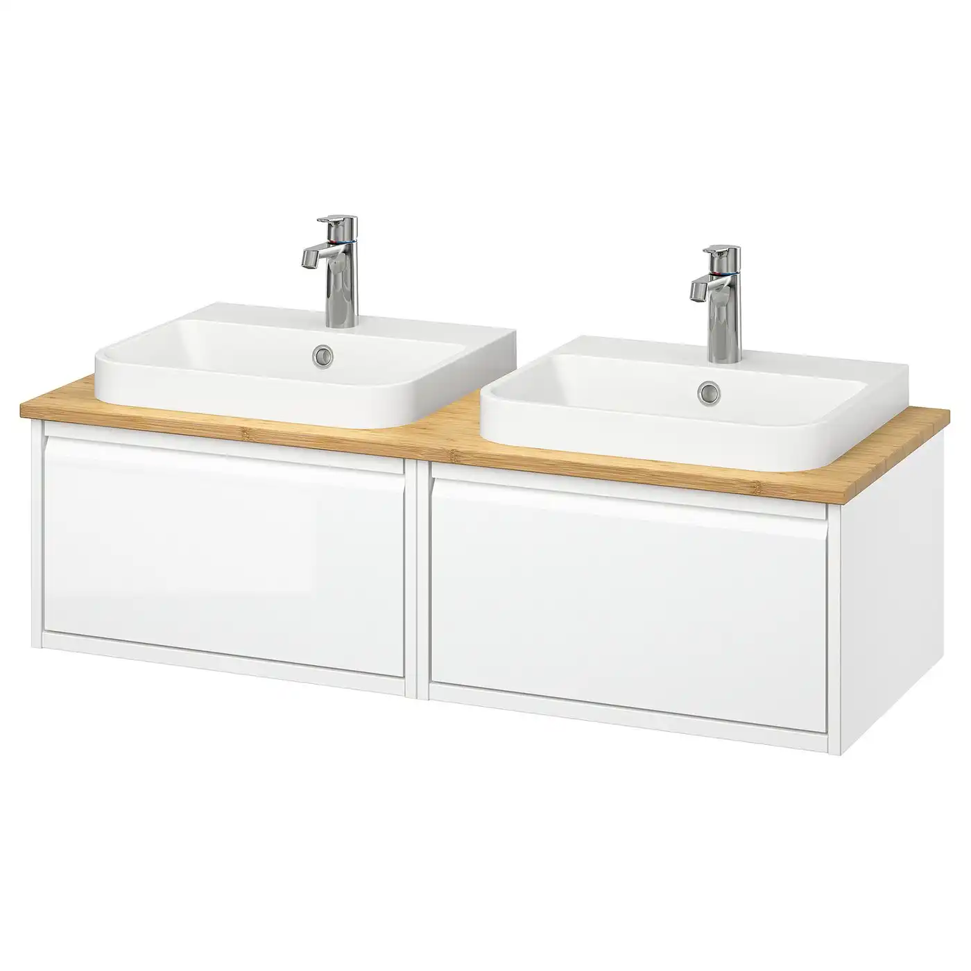 ÄNGSJÖN / BACKSJÖN Wash-stand/wash-basins/taps - high-gloss white/bamboo 122x49x41 cm