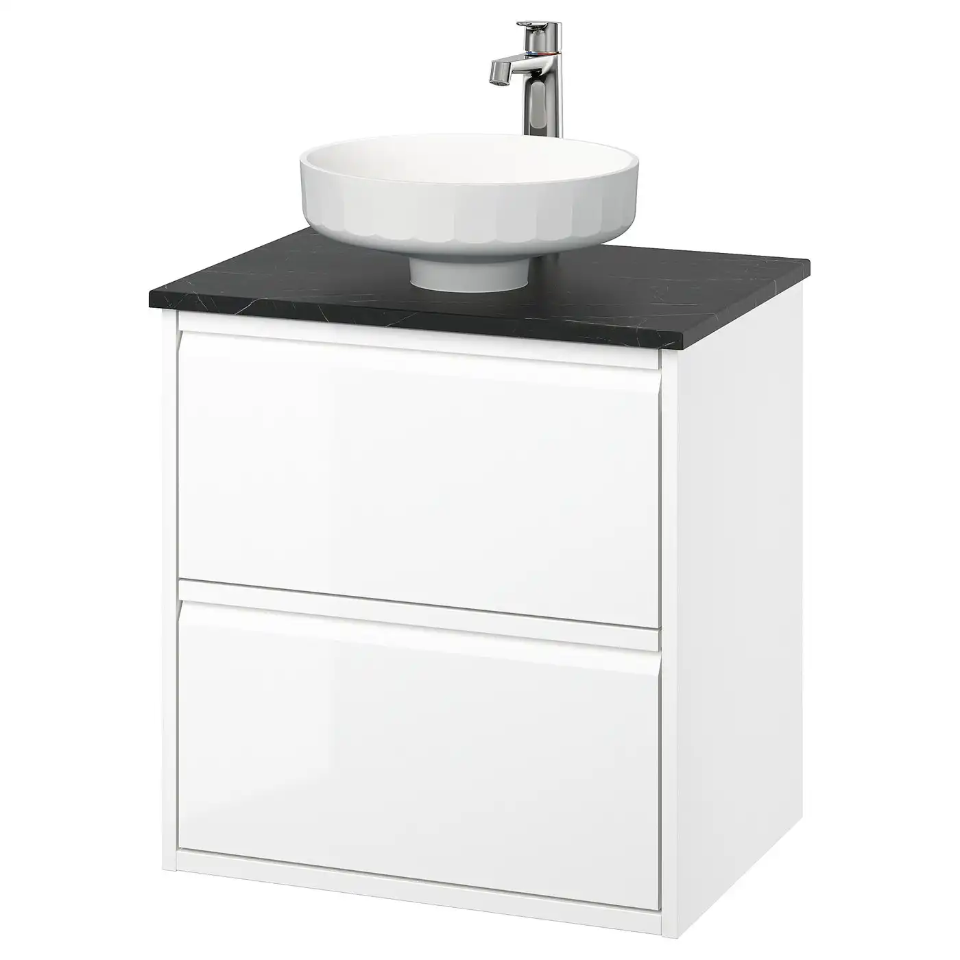 ÄNGSJÖN / LERSJÖN Wash-stnd w drawers/wash-basin/tap - high-gloss white/black marble effect 62x49x79 cm