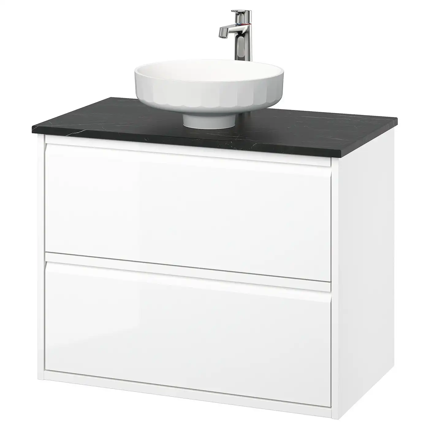 ÄNGSJÖN / LERSJÖN Wash-stnd w drawers/wash-basin/tap - high-gloss white/black marble effect 82x49x79 cm