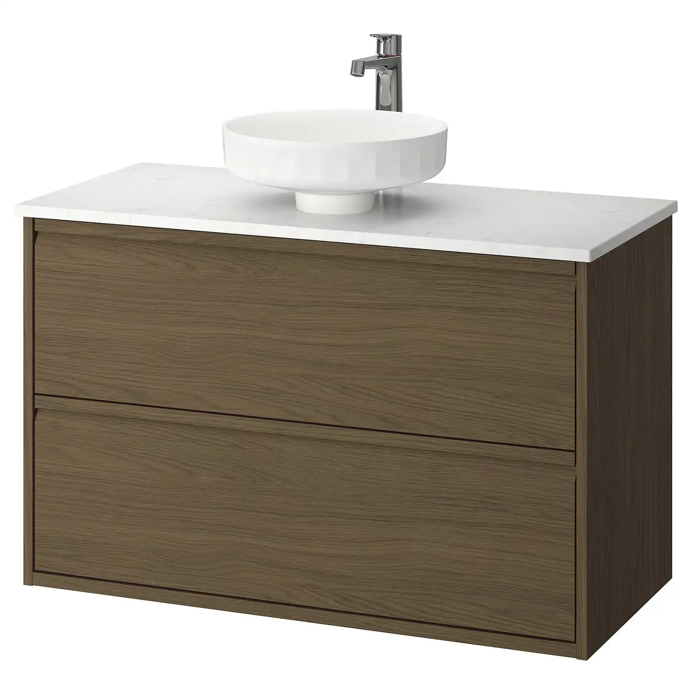 ÄNGSJÖN / LERSJÖN Wash-stnd w drawers/wash-basin/tap - brown oak effect/white marble effect 102x49x79 cm