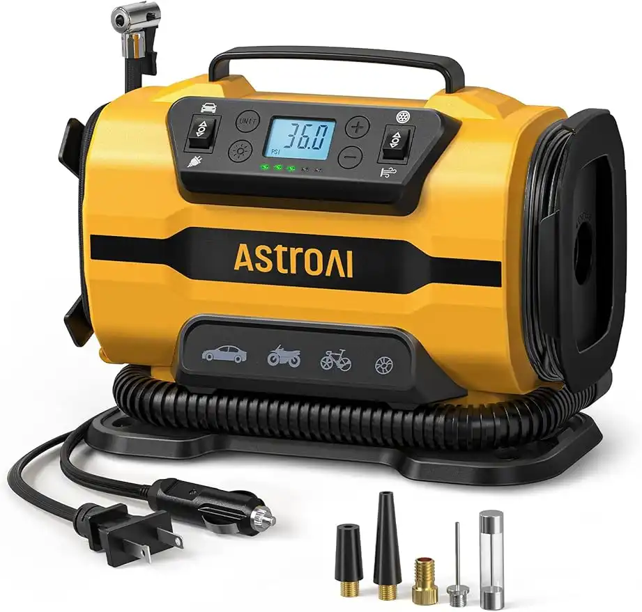 AstroAI Tyre Inflator Air Compressor 150PSI, Power Supply 12V DC / 220-240V AC, Tyre Pump with Dual Metal Motors & LED Light, Car Accessories for Car, Bicycle and Air Mattresses (Yellow)