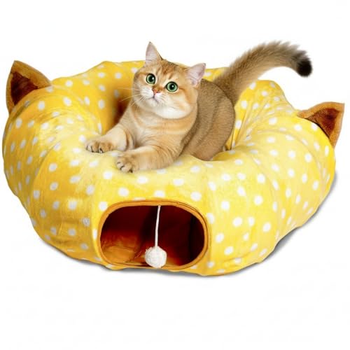 AUOON Cat Tunnel Bed with Central Mat Under Christmas Tree,Big Tube Playground Toys,Full Moon Shape for Kitten,Cat,Puppy,Rabbit,Ferret,Yellow