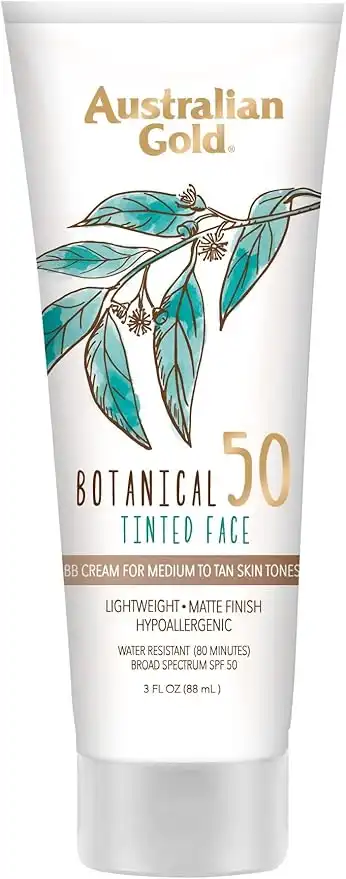 amazon.aeAustralian Gold Botanical SPF 50 Tinted Mineral Sunscreen for Face, Non-Chemical BB Cream, Water-Resistant, Matte Finish, For Sensitive Facial Skin, Medium to Tan Skin Tones, 3 FL Oz