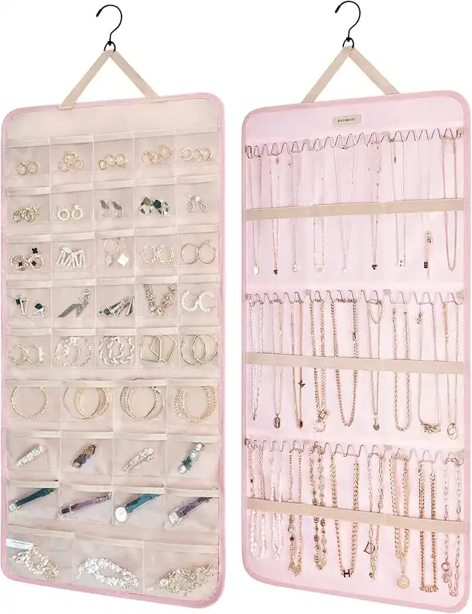 BAGSMART Hanging Jewelry Organizer Storage Roll with Hanger Metal Hooks Double-Sided Jewelry Holder for Earrings, Necklaces, Rings on Closet, Wall, Door, 1 piece, Extra Large, Pink — Price History & Tracker | DeserTracker