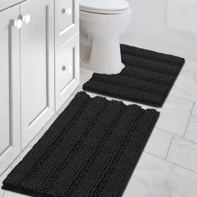 amazon.aeBathroom Rugs Bath Rug Set 2 Piece Bathroom Contour Rug Toilet Mat Sets Non Slip Contour Bath Rug Set Ultra Thick Water Absorbent Striped Bath Mats Washable(20" x 32" Plus 20" x 20" U, Black)