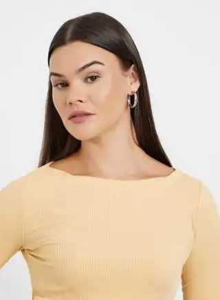 Beige Ribbed Knit Boat Neck Top