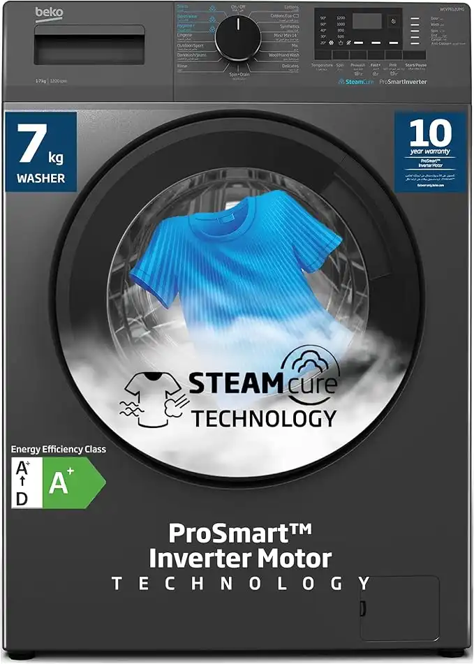 Beko 7 kg Front Load Washing Machine,1200 RPM,15 Programmes,Low Noise,Quick wash 14/28 Minutes,SteamCure Wash,Digital Display,DrumClean,10 Years Warranty on ProSmart Inverter Motor,WCV7612UMG(Grey)