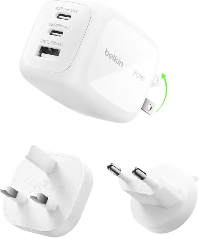 Belkin 3-Port USB-C Plug 70W, Multi-Port GaN Wall Charger with 2x USB-C & 1x USB A Ports, UK and US Plug Tips, Fast Charging for MacBook, iPhone 17, iPad, Samsung Galaxy S25, Google Pixel, etc - White