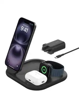 amazon.aeBelkin BoostCharge 3-in-1 Wireless Charging Stand with Qi2 15W, MagSafe Compatible Fast Charger for iPhone 17, Air, 16, 15, 14, 13, 12 Series, PixelSnap, AirPods, Apple Watch (PSU included) - Black