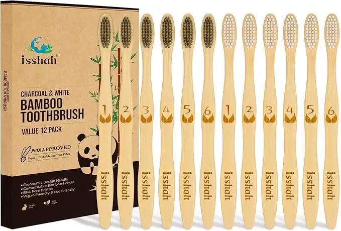 Biodegradable Eco-Friendly Natural Bamboo Charcoal Toothbrushes, FSC Certified and PETA Approved - 12 Count
