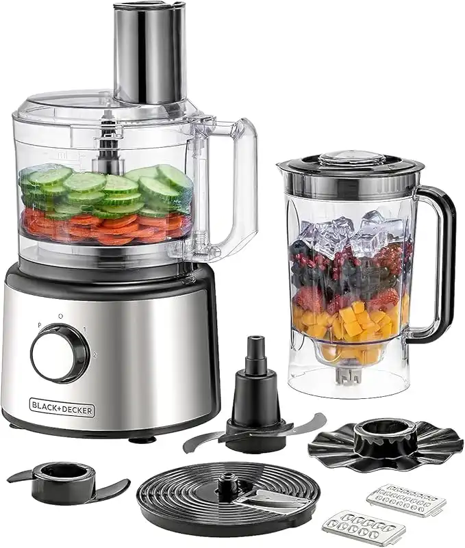 BLACK+DECKER 5-in-1 Food Processor, 750W Power, 2L Processing Bowl, 1.8L Blender Jar with Stainless Steel Blades, 34 Functions for Chopping, Slicing, Shredding, Compact Design, Black - FX775-B5