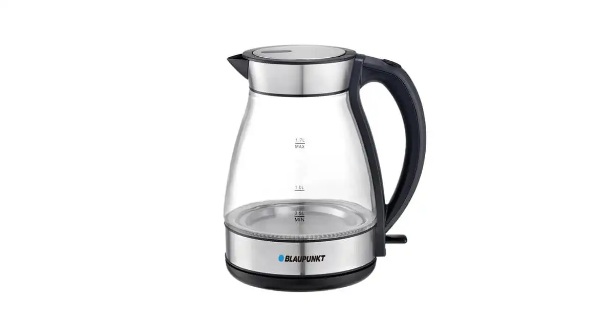 Blaupunkt 2200W Cordless Glass Kettle With 1.7L Borosilicate Body, Soft Blue LED Light, Auto Shut-Off And Boil-Dry Protection, 360° Swivel Base And Spill-Free Spout For Quick And Safe Tea Coffee Preparation BKG422