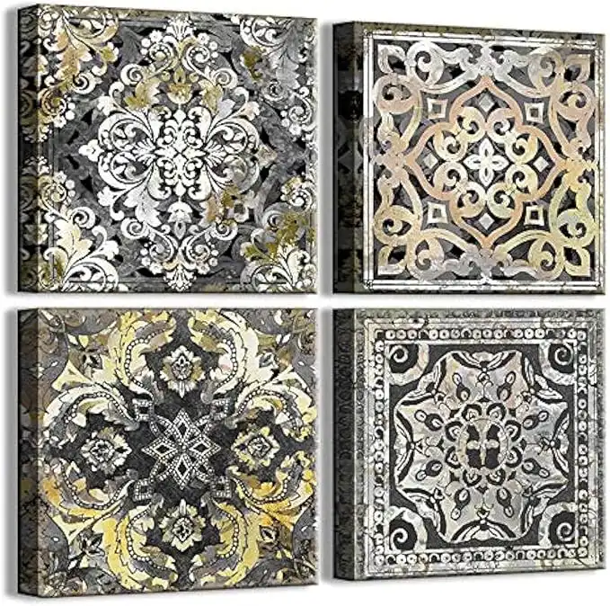 amazon.aeBoho Decor Mandala Prints for Bathroom Yellow Black Vintage Flowers Pattern Canvas Wall Art 4 Pieces Artwork Framed Wall Art Modern Home Decor Wall Decorations for Bedroom Kitchen Size 14x14 4 pieces