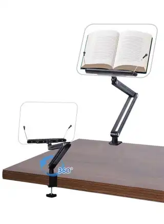 Book Stand for Reading, Acrylic Desk Clamp Book Holder, Cookbook Stand for Kitchen, Recipe Book Stand with Clamp, Height and Angle Adjustable, Foldable and Portable for Office