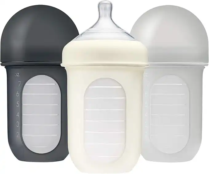 Boon Nursh Reusable Silicone Pouch Baby Bottles - Medium Flow Nipple - Silicone Baby Bottle Pouch and Nipple - New Born Feeding Essentials - Gray - 3-6 Months - 3 Count - 8 Ounce