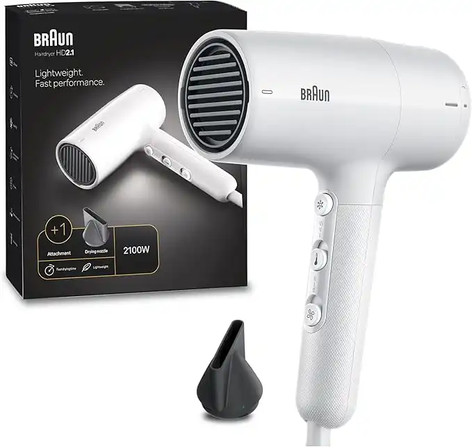 Braun Hair Dryer HD2.1, 2100 Watts, Fast Performance, 2100 Watts, Nozzle Attachement, Filter Clean Indicator, 195cm Cord, BRHD210SDE -Conc White