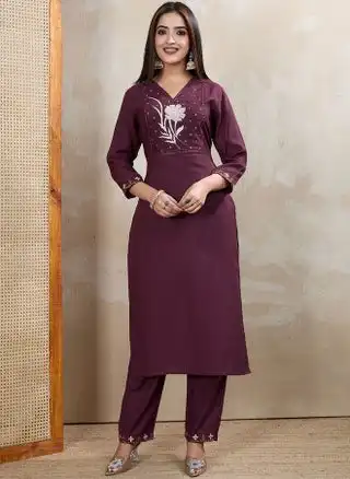 Burgundy Floral Embroidered Kurta with Trousers for Women