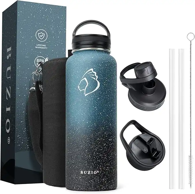 BUZIO 40 oz Water Bottle Insulated with Straw & 3 lid and Carrying Pouch, Leak Proof Anti-Slip Stainless Steel Water Flask Jug, Cold for 48 Hrs Double Vacuum Thermo Canteen, BPA-Free, Blue — Price History & Tracker | DeserTracker