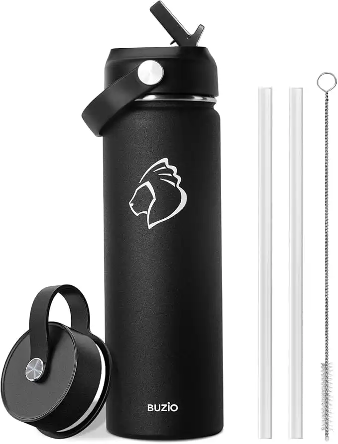 amazon.aeBUZIO Insulated Water Bottle, Stainless Steel Water Bottle with Straw 650 ml Double Walled Wide Mouth Sports Drink Flask with BPA Free Straw Lid and Flex Cap Cold for 48 Hrs, Black
