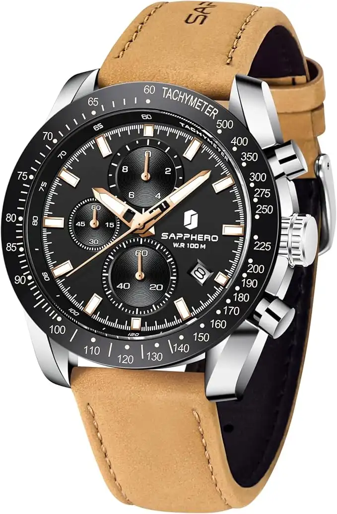 BY BENYAR Waterproof Chronograph Analog Watch With Leather Strap For Men - Brown, 100m — Price History & Tracker | DeserTracker