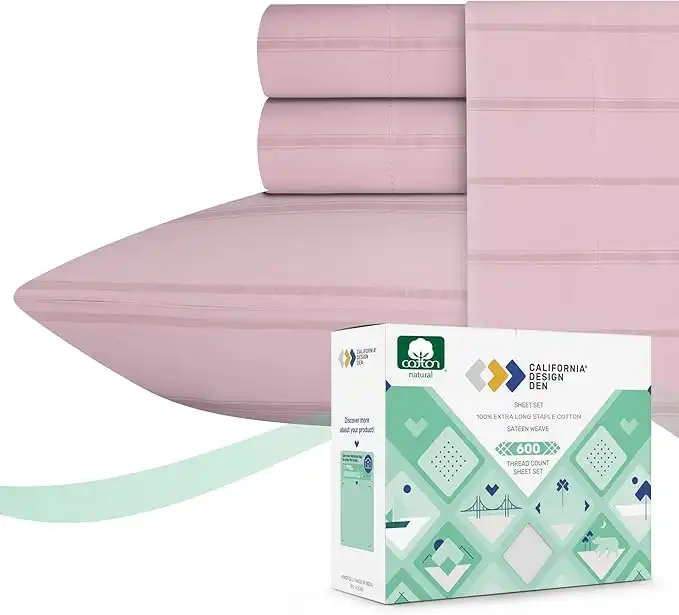 California Design Den - 5 Star Luxury Queen Sheet Set 100% Cotton Sheets, 600 Thread Count Sateen, Deep Pocket, Snug FIt, Soft & Crisp Printed Sheets Set, 4 Pc (Queen, Classic Stripe - Pastel Rose)