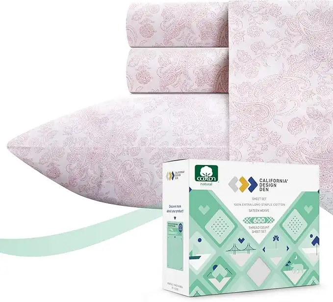 amazon.aeCalifornia Design Den - 5 Star Luxury Queen Size Sheets 100% Cotton Sheets, 600 Thread Count Sateen Weave, Deep Pocket, Snug Fit, Soft & Crisp Printed Bedding Set, 4 Pc (Queen, Vintage Paisley - Pink)
