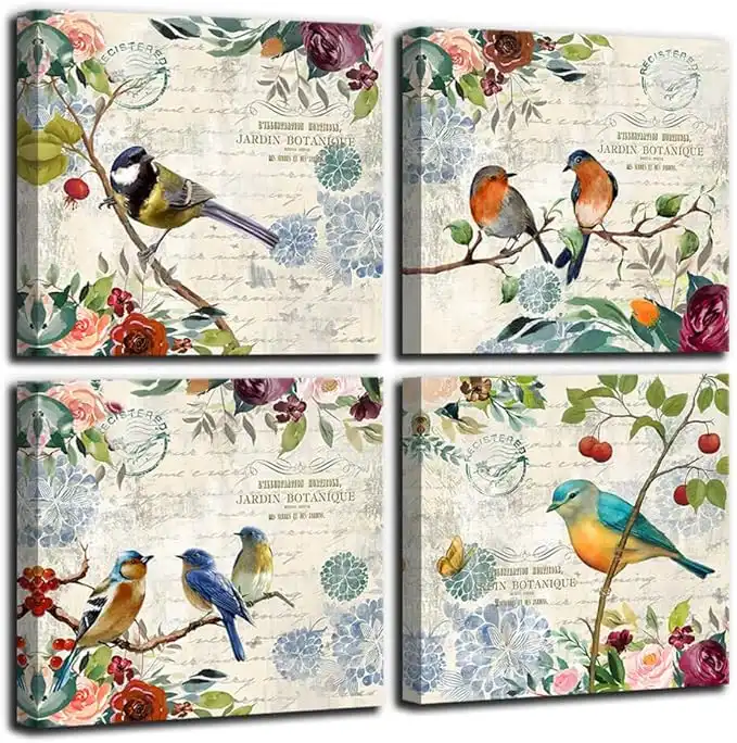 amazon.aeCanvas Wall Art for Bedroom Bathroom Decor Framed Wall Decoration Bird in Green Leaf Red Flower Modern Print Picture Artwork Garden Themed Ready to Hang for Kitchen Wall Decor Size 14x14 Each Panel