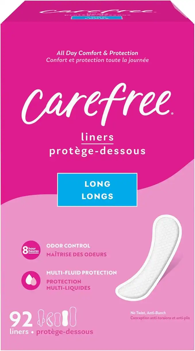Carefree Panty Liners for Women, Long, Unwrapped, Unscented, 92ct | Pantiliners, Carefree Liners, Daily Liners for Women, Light Periods and Leaks, 8-Hour Odor Control | 92ct (Packaging May Vary)