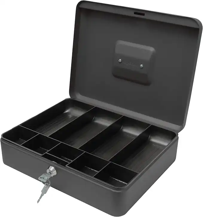 Cathedral Products Key Lockable Cash Box with Lift Out 6 Compartment Coin Tray - 12 Inch - Black