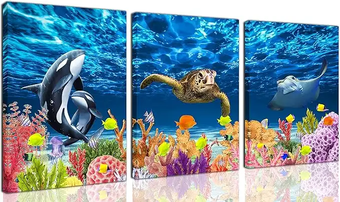 CGXART Bathroom Decor Wall-Art - Sea Turtle Decor - Blue Wall Art for Living Room Killer Whale Mobula Colorful Fish Coral Beach Theme Pictures on Canvas Framed Size 12x16 Inches x3 Pieces — Price History & Tracker | DeserTracker