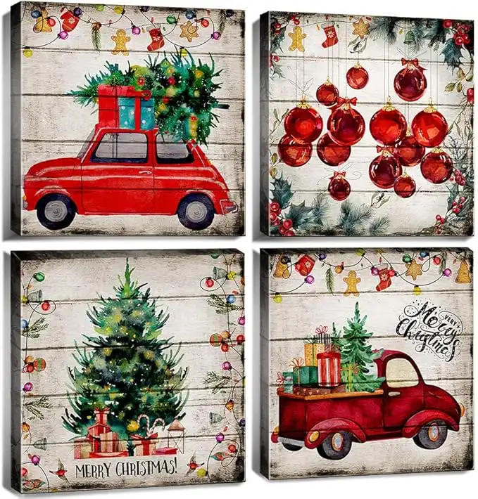 amazon.aeChristmas Wall Art Red Truck Wall Decor Christmas Pictures for Living Room Christmas Tree Car Balls Wood Grain Background Canvas Painting Farmhouse Posters Bedroom Kitchen Home Decorations 12x12" 4Pcs